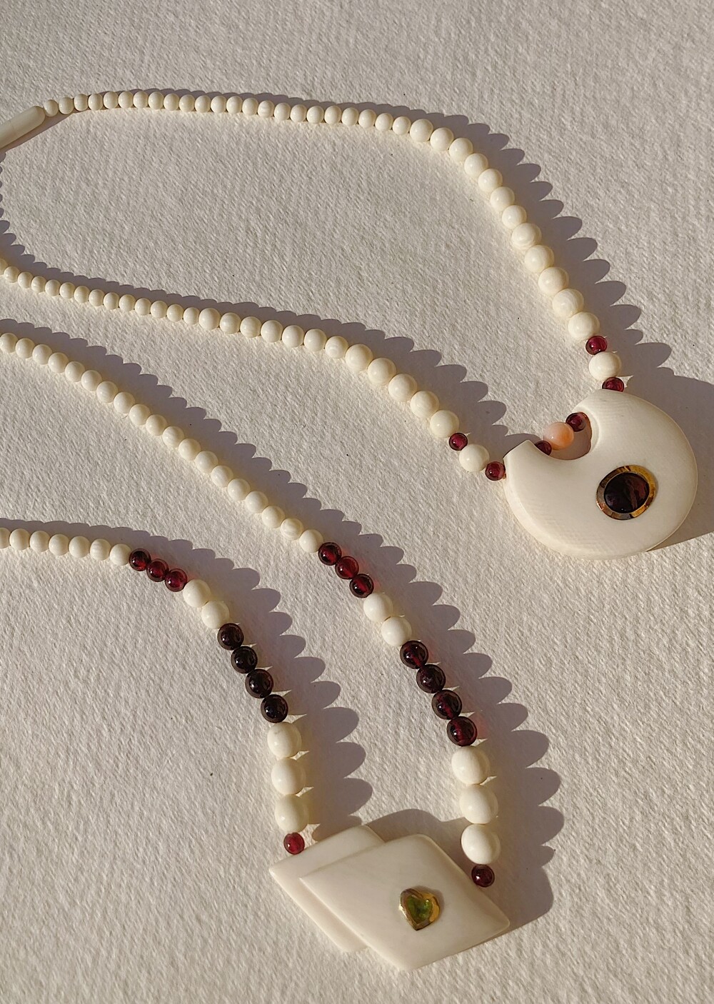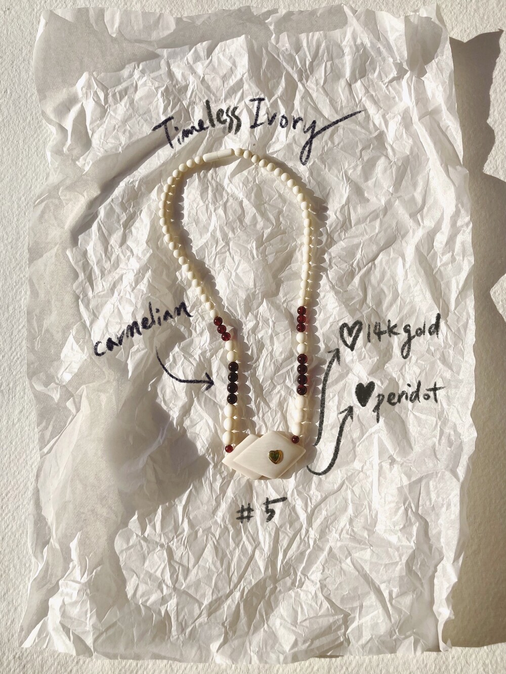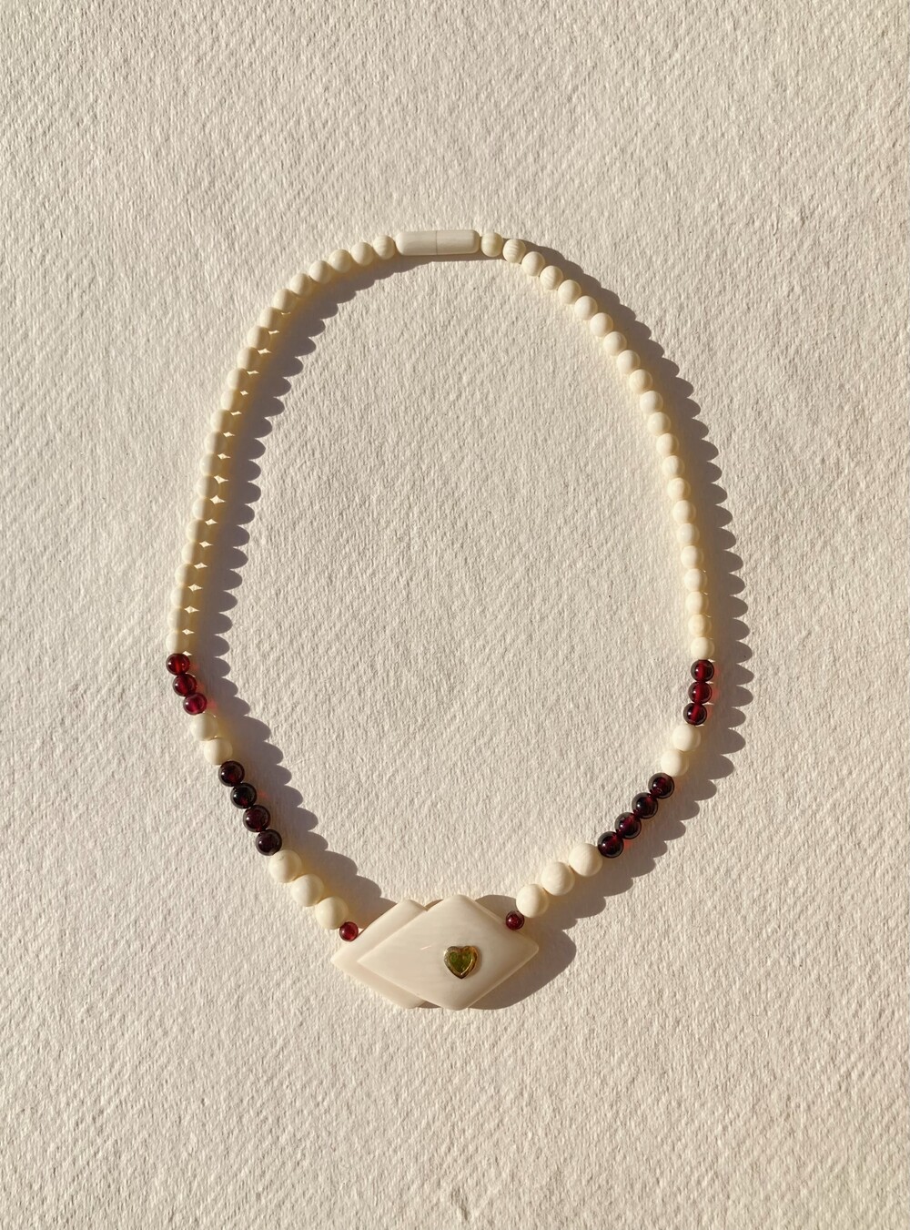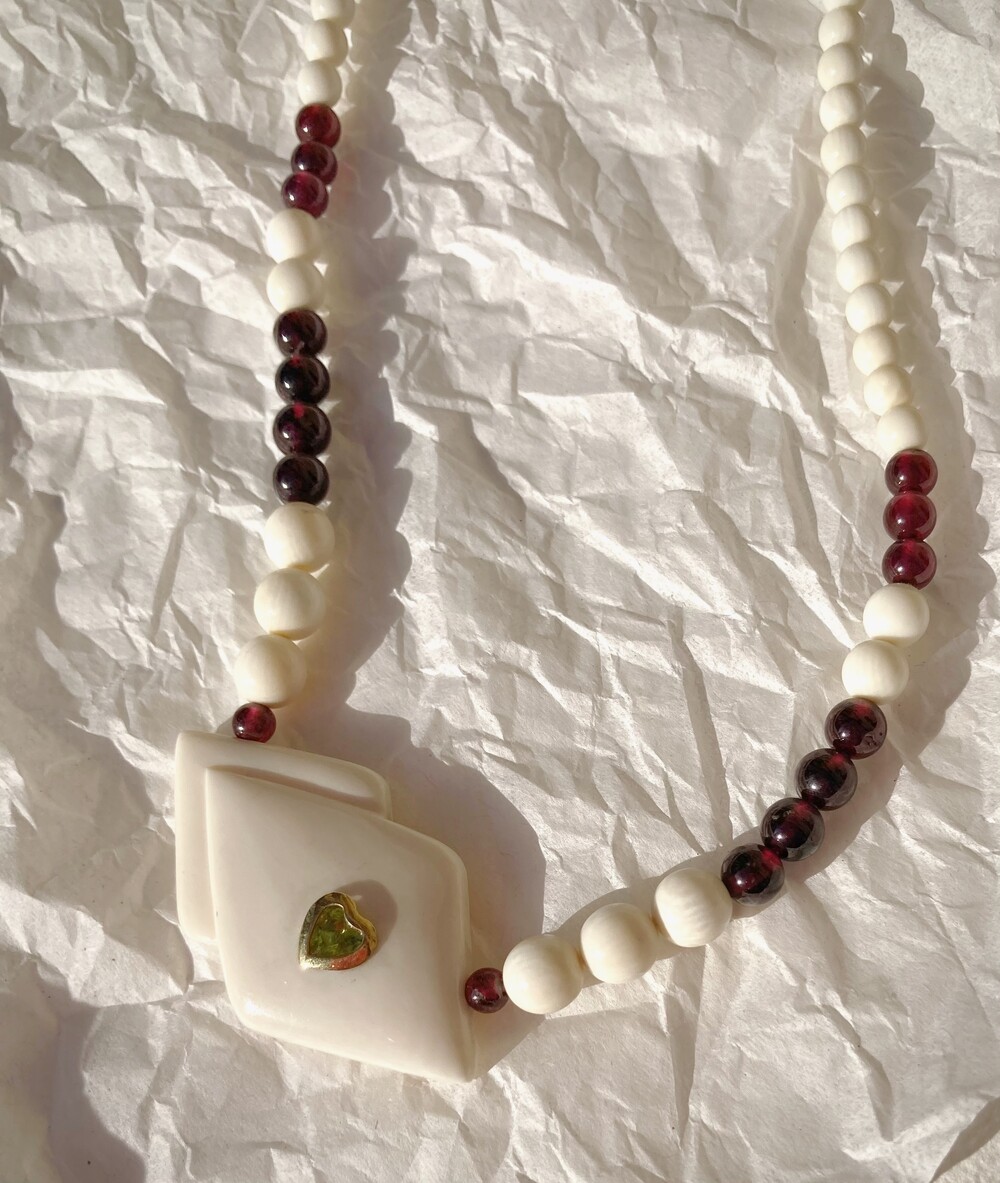 - 섬세한 핸드메이드로 다듬은 상아 비즈들과 와인 빛의 카넬리안 원석들, 14K 골드 하트 안에 들어있는 영롱한 페리도트 원석이 박힌 팬던트는 경쾌하면서도 독특한 존재감이 있습니다.